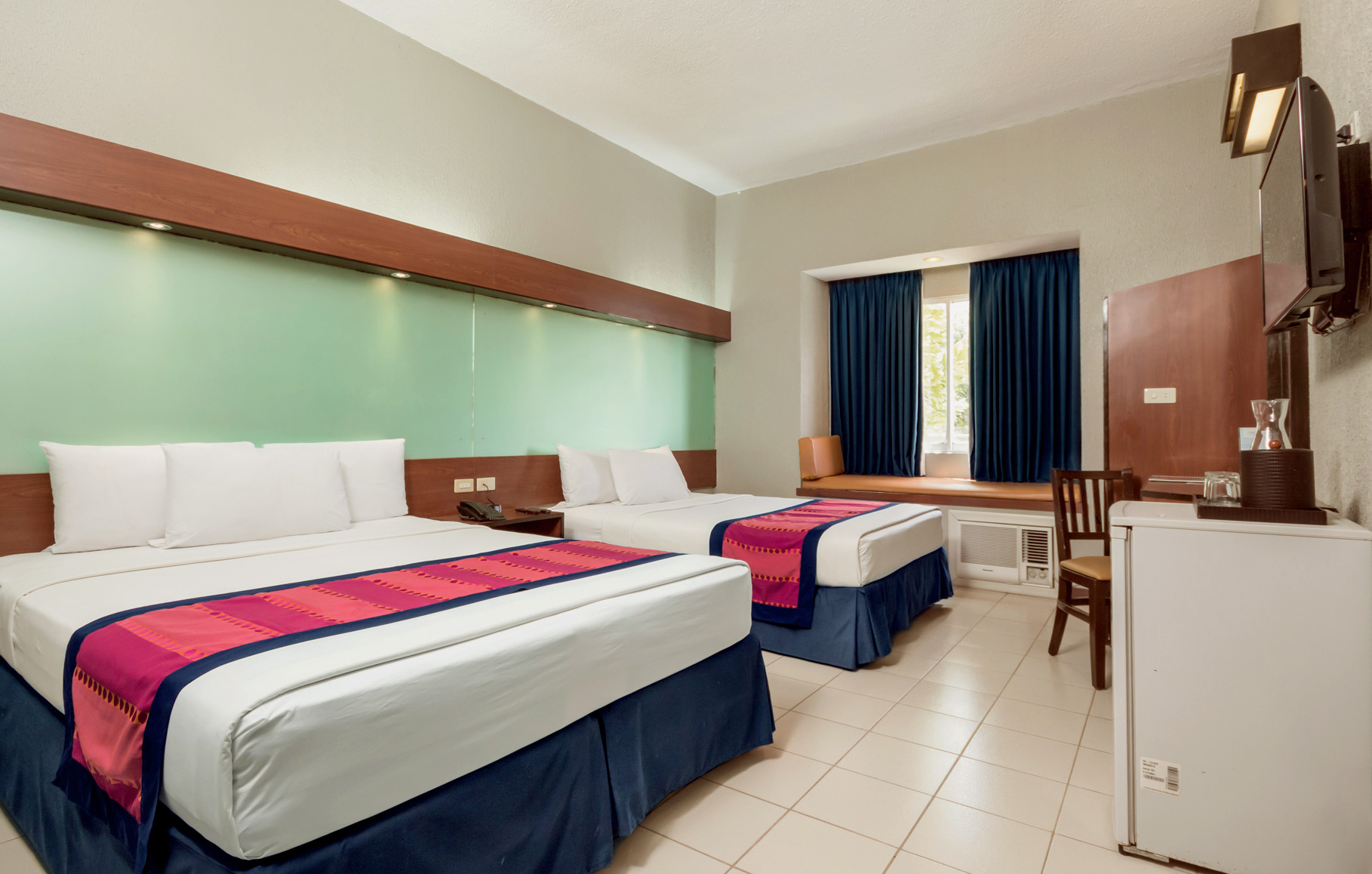 Two queen beds, airconditioned, non-smoking , window seat, wardrobe cabinet, desk with mirror and chairs, flat TV, luggage rack, personal refrigerator, ice bucket and pitcher set, toilet & bath with amenities, wifi access