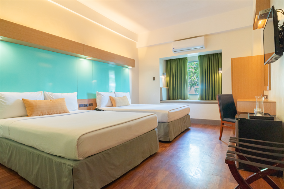 Two queen beds, airconditioned, non-smoking , window seat, wardrobe cabinet, desk with mirror and chairs, flat TV, luggage rack, ice bucket and pitcher set, toilet & bath with amenities, wifi access